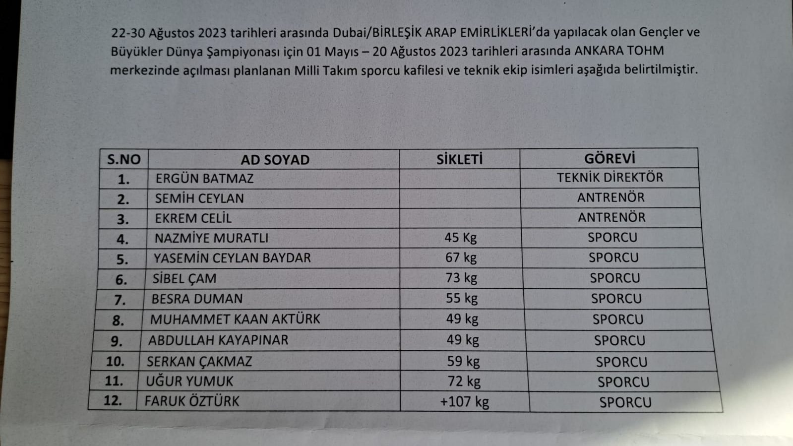 GENÇ ERKEKLERDÜNYA HALTER ŞAMPİYONASI HAZIRLIK KAMP
