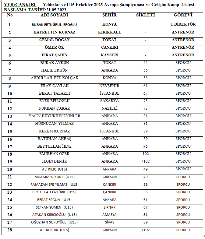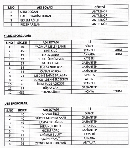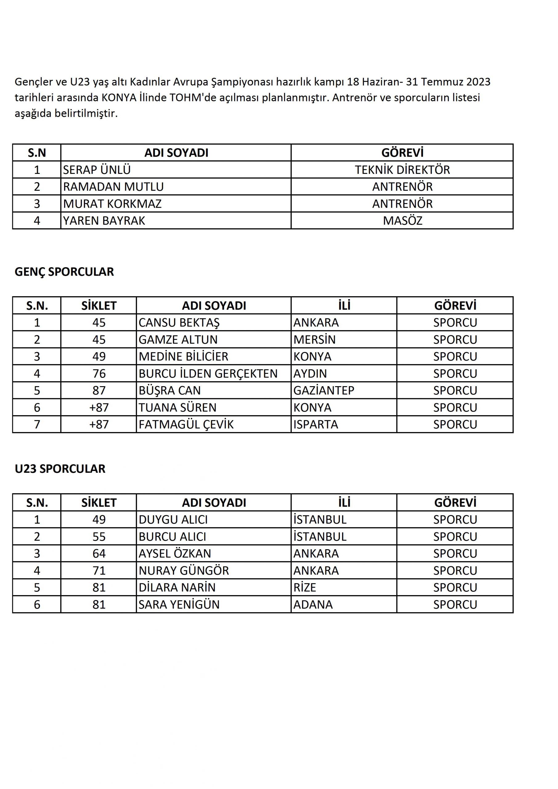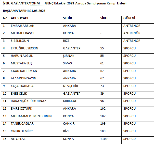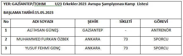 1-Mehmet DOĞAN ANTRENÖR2-İsa MAKAL ANTRENÖR3-Muaamer ŞAHİN SPORCU4-Ferdi HARDAL SPORCU5-İbrahim ARAT SPORCUKampa katılan Antrenörlerimiz ve sporcularımız, kampa gideceği tarihten en az 2 gün (48 saat) öncesine ait negatif sonuçlu pcr test sonucunu kamp müdürüne ibraz etmesi zorunludur.